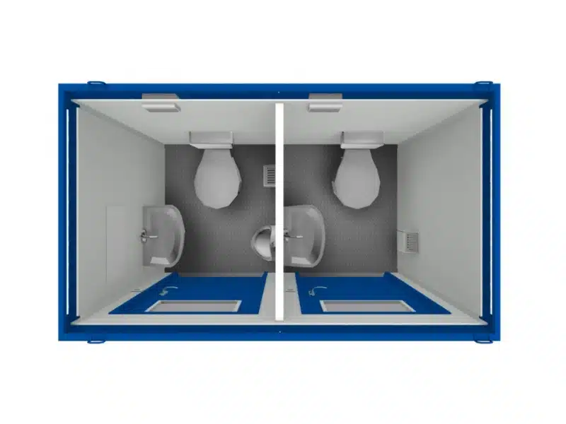 Duo de cabines de toilettes 3,36 m² (2,4 x 1,4 m) entièrement isolées avec lavabo, chauffage, eau chaude, éclairage et prise électrique. 1 fenêtre et 1 porte ouvrant sur l’extérieur par toilette. Décor intérieur blanc, sol alu strié. Marquage CE et conformes aux normes incendie. Disponible rapidement sur dépôt.