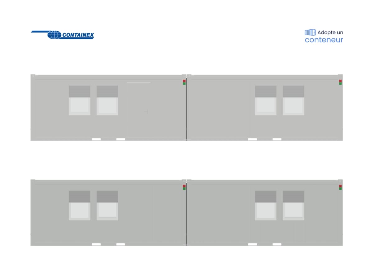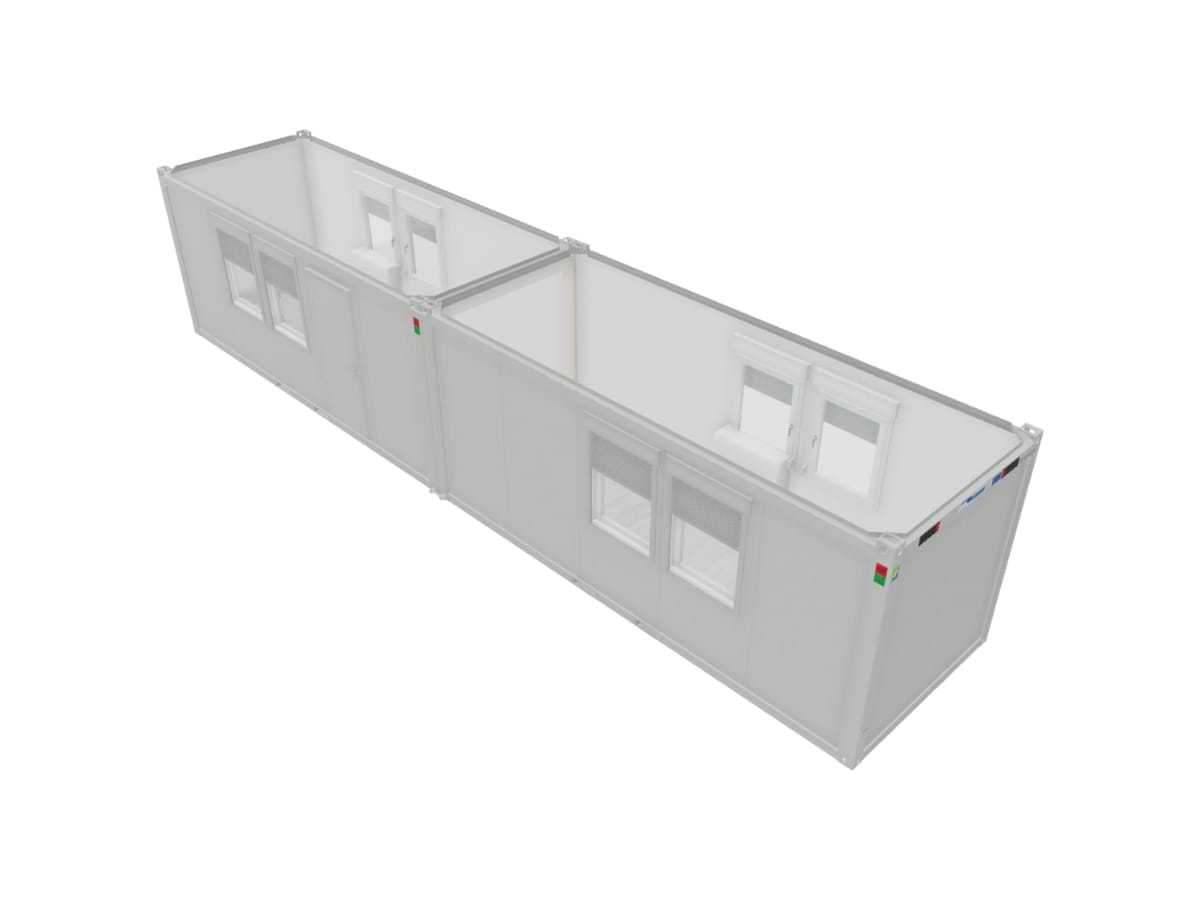 Bungalow offrant 29,4 m² (12,15 m x 2,44 m). Isolation laine de verre (100 mm en toiture, 60 mm au sol) et mousse PU (60 mm aux murs). 8 fenêtres oscillo-battante. 1 porte ouvrant sur l’extérieur. 4 rampes d’éclairage LED. 4 prises électriques doubles. PAC réversible 3,1 kW. Décor intérieur blanc, revêtement de sol gris. Marquage CE et conformes aux normes incendie. Disponible sur commande.