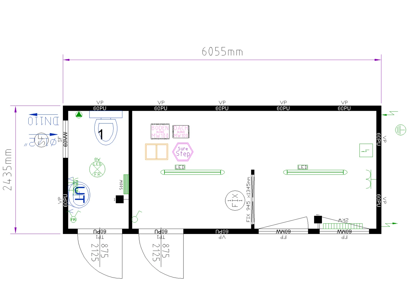 Bungalow offrant 14,7 m² (6,06 m x 2,44 m) pour une zone bureau et un WC séparé en accès extérieur. Isolation laine de verre 60 mm murs et sol, 100 mm en toiture. 2 fenêtres oscillo-battante. 2 portes ouvrant sur l’extérieur. 3 fenêtres. Eclairages LED. Prises électriques. Chauffage convecteurs électriques. Décor intérieur blanc, revêtement de sol gris. Marquage CE et conformes aux normes incendie. Disponible rapidement sur dépôt.