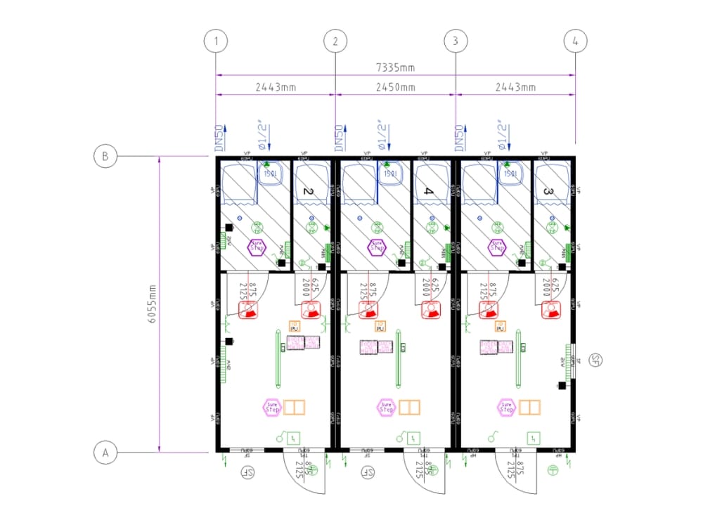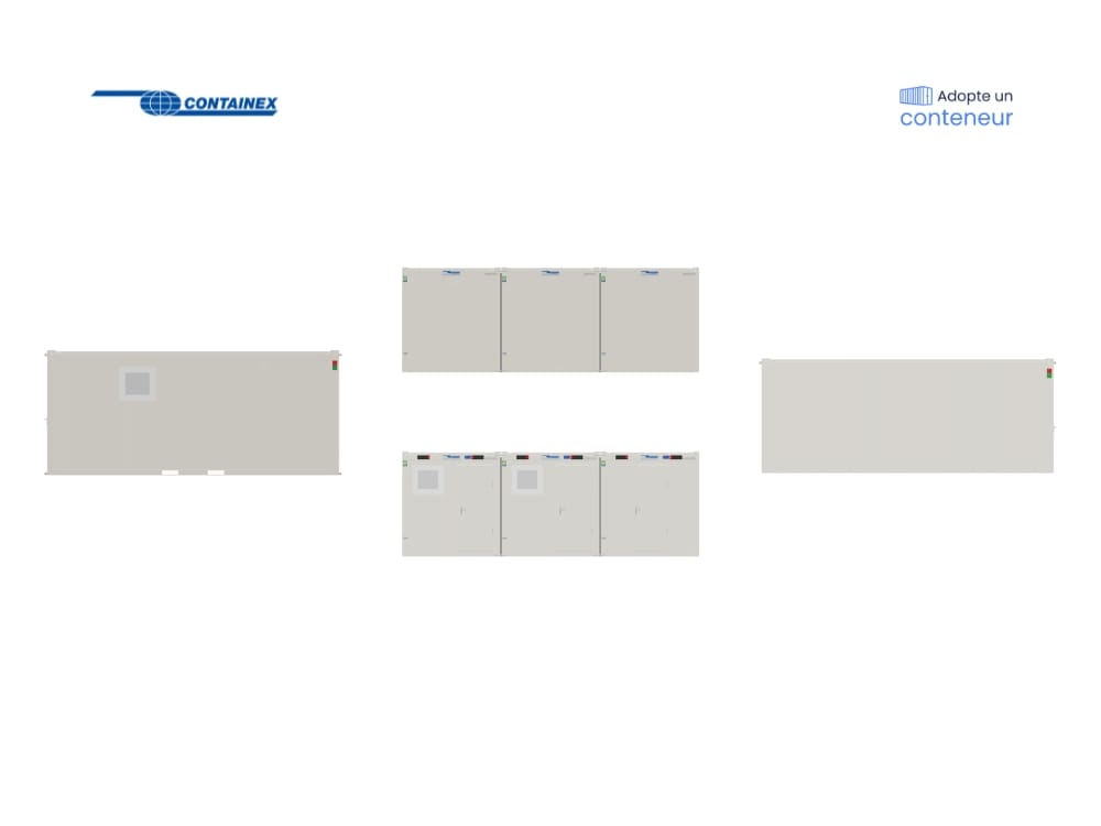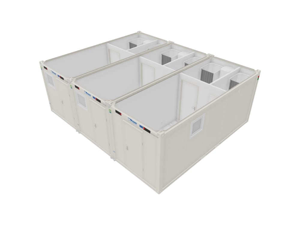 Ensemble modulaire offrant 3 vestiaires séparés comprenant chacun un espace de change dédié et 2 douches. Assemblage de 3 module de 20 pieds sur 44,4 m². Entièrement isolé avec chauffage électrique, eau chaude (ballons de 150L), éclairage et prises électrique. 3 portes ouvrant sur l’extérieur. 2 fenêtres vasistas. Décor intérieur blanc, sol PVC antidérapant. Marquage CE et conforme aux normes incendie. Disponible sous 8 à 10 semaines.