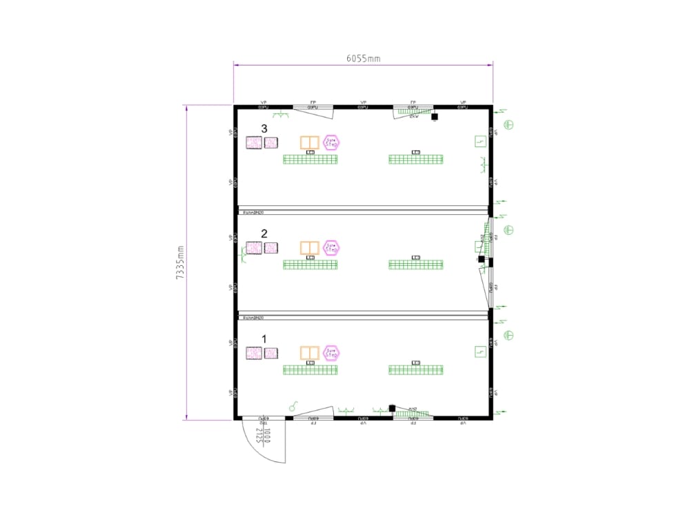 Bungalows 20 pieds assemblés offrant un grand espace de travail (7,33 x 6,06 m). Isolation laine de verre 100 mm sol et toiture. Isolation PU 60 mm aux murs. 6 fenêtres oscillo-battantes à volets roulants. 1 porte extérieure. 6 rampes d’éclairage LED. 6 prises électriques doubles. Chauffage convecteurs électriques 2kW.  Décor intérieur blanc, revêtement de sol gris. Marquage CE et conformes aux normes incendie. Disponible sur commande.