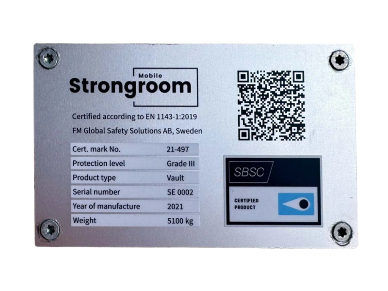 Chambre forte aménagée dans un container maritime 20 pieds Dry avec plaque de navigabilité CSC. Véritable coffre-fort mobile approuvé pour le stockage d’argent liquide, d’armes et d’explosifs. Certifié EN 1143-1 classe 3. Porte double dotée d’une serrure à code électronique.