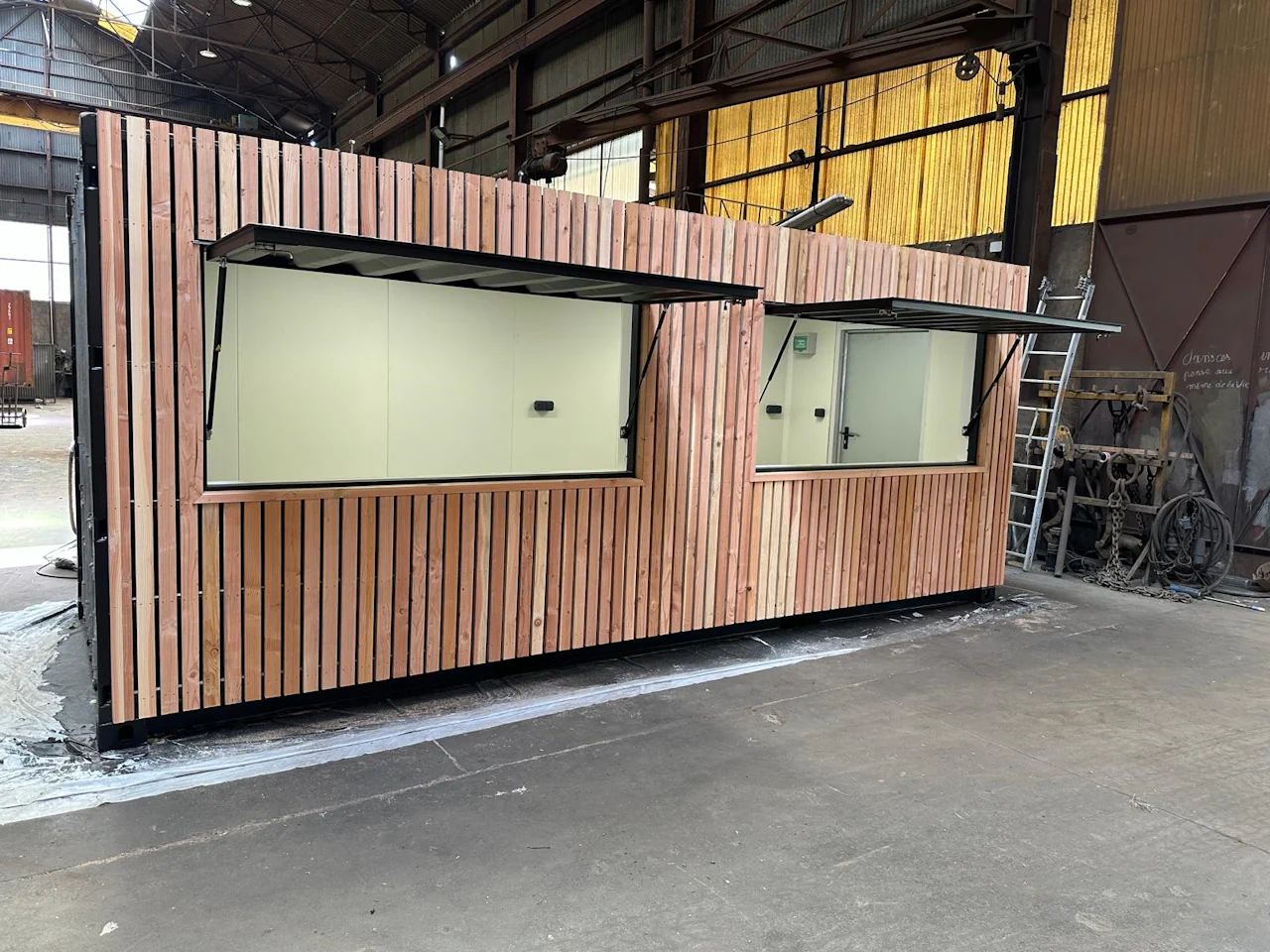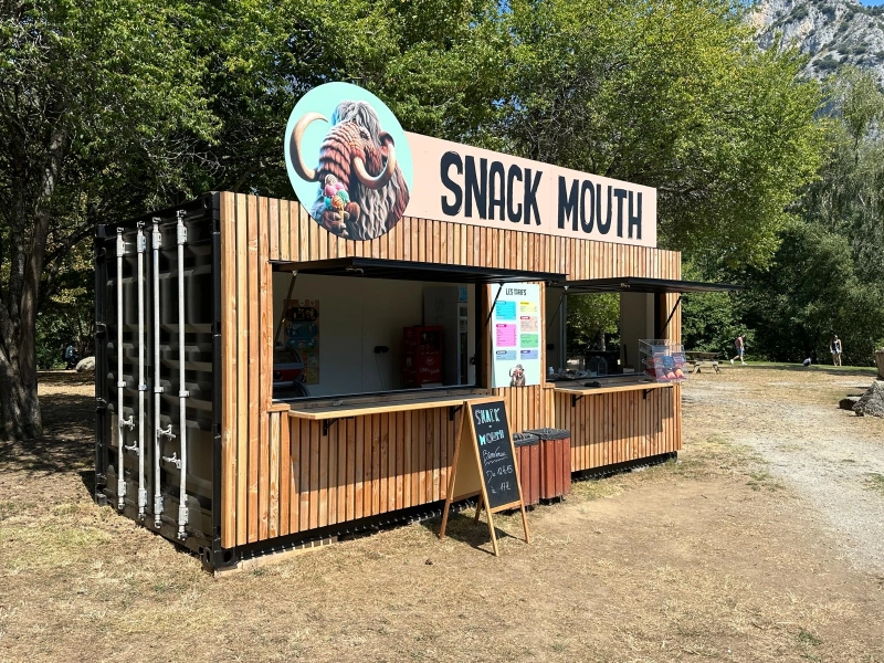 Container maritime aménagé en snack ou bar. Doublage isolant murs et plafond et sol aux normes d’hygiène. Electricité et éclairage. Arrivée d’eau. Tablettes rabattables. Bardage bois Douglas à claire-voie.